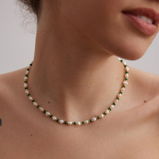 Freshwater Pearl Emerald Gold on Silver Beaded Necklace
